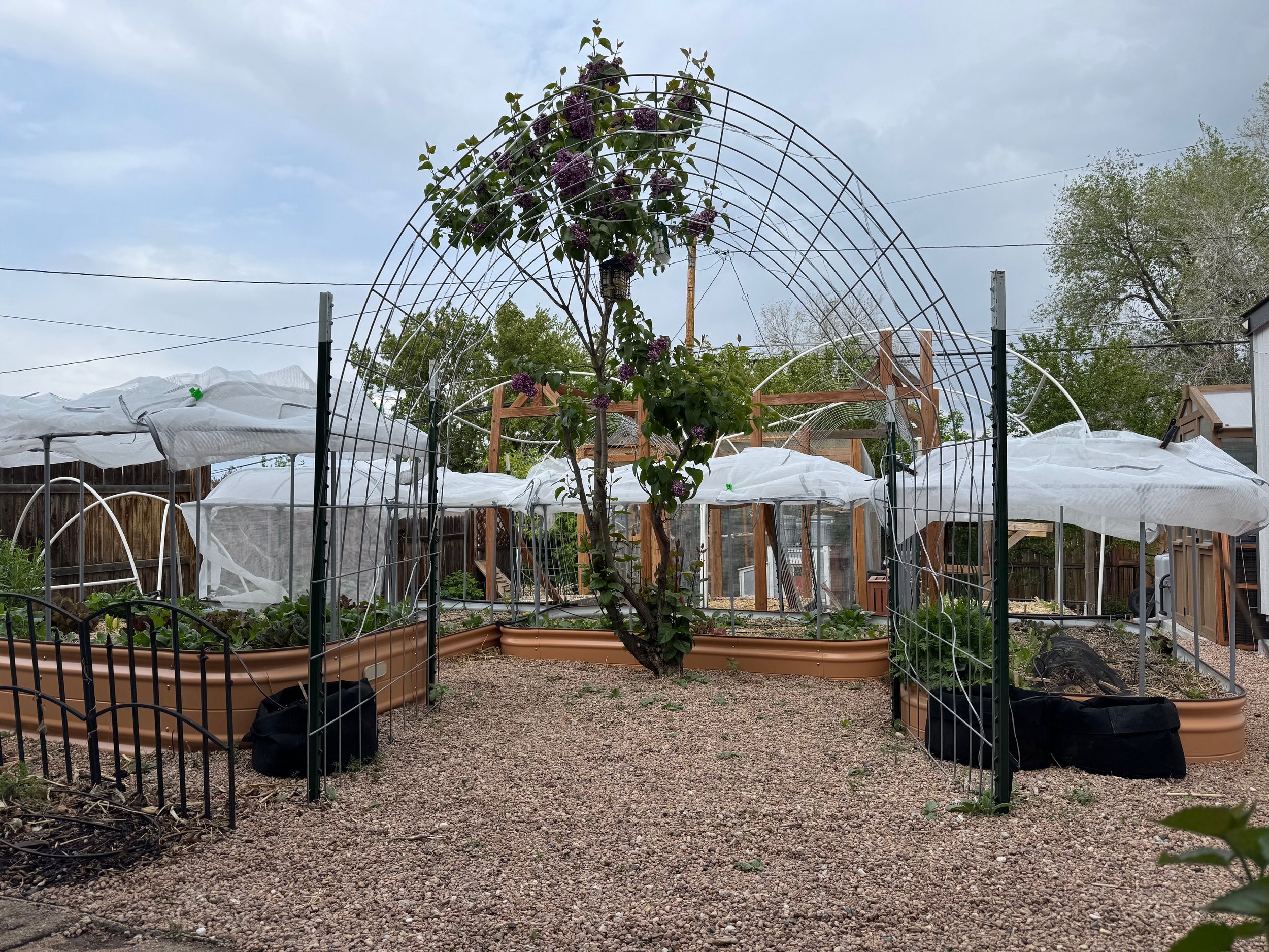 Shade cloth - our yard has no shade whatsoever; adding some shade can help keep the moisture in the soil and keep plants from becoming thirsty when things are dry in the hottest part of the day. Burlap works great as shade cloth, as does window screen you can purchase at the hardware store. We’ve used everything from insect netting to frost cloth to add a filter between the sun and our plants with success. In Colorado, you need hail protection, so our shade cloth does double duty by protecting the garden from our harsh altitude sunlight and hail.