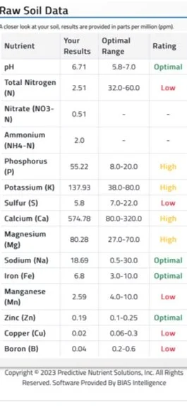 If you noticed a particular issue in your garden; maybe something did very poorly, or overall, you didn’t have the production you expected, a soil test is a great thing to do before spending money on soil amendments. When we were new gardeners, we just peppered in things we thought might help at the end of the season without any real insight into what was going on in our soil. You can see from the results of our soil test above, that adding phosphorus to our soil for instance would’ve only increased our soil imbalance. Additives can sometimes hurt more than help, especially if you’re not sure what the overall picture looks like.